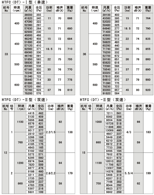(1).HTFC(DT)系列消防通风(两用)低噪声式离心风机分为I。II。I为单速,II为双速。该系列风机有较多的性能参数,以满足不同用户的需要。