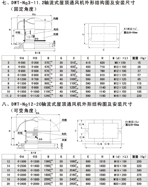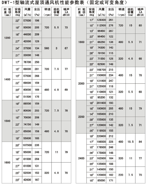 一、特点 1.型式规格多,应用范围广:可根据使用场合的风量,风压和噪声的不同要求,选用以下型式的风机: 轴流式屋顶通风机:代号为DWT-I型,具有风量大,压力较离心式风机的特点。同时根据用户要求还可设计成双向旋转可逆式,具有正反式况等效的特点。 2.效率高噪声低本风机系采用先进的CAD系列软件,经多目标优化设计开发。本系列风机中1200.1400.1500.1600.2000.及2400mm风机采用同值径不同转速,不同角度改变几量.风压的方法,以满足不同使用工况的需要,达到风机与系统匹配,以利实现节能和降低噪声; 3.质轻。高强。耐腐蚀;风机叶轮可根据工作空气介质不同的腐蚀性而采用不同的材质,分别有ABS(工程塑料)FRP(玻璃钢)和铝合金板材制作,对于压力要求高,风机转速较大的离心风机,叶轮表面较特殊的镀锌加喷塑耐蚀处理,不仅降低整机重量且有良好的耐腐蚀能力; 4.运转平稳,寿命长;本风机的转动惯量小,动平衡精度高,运转平稳,各项性能指标的工厂内控标准要求均高于风机待业标准,能确保风机长期稳定地运行; 5.适用面广:本风机可以根据使用要求,制造成防爆型,阻燃型,适用于抗老化,抽送易燃易爆及有腐蚀性气体的场合; 6.外型美观:本风机的风帽部件采用玻璃钢制作,外表采用进口胶衣树脂膜,曲面过渡柔和,美观大方,实用性强;也可根据用户要求制成钢风帽经镀锌喷塑(PVC)处理; 7.使用条件:介质温度不超过60摄氏度,气体中不允许含有过量粘性物,含尘量小于100mg/m。对介质温度高的场合,我厂有高温风机技术可提供产品使用。 8.本产品经浙江省产品技术监督所检测合格,检测项目含阻燃,导电性能,防爆,抗风性能等,由市产品技术监督局监制。二、型号结构说明 1.轴流式屋顶风机直径自300-2400mm,供十七种机号,离心式屋顶风机有300-1000mm九种机号。还可根据用户需要提供其它机号的风机; 2.各种型号的风机结构可参阅总装图,它由叶轮,风筒,风帽,传动部件,活页风门,防鸟网,安全网等部件组成;(以上配置,按用户要求制作) 3.风机传动形式:DWT-1型风机直径<_2200mm采用电机直联传动,2200mm以上风机采用皮带传动形式,也可根据客户要求采用减速器传动形式,活页风门有重力式,电动式和手动式三种。 4.屋顶风使用范围广且数量大,根据用途的需要结构形式繁杂,本厂可按用户不同的技术要求,进行研制开发,并对外形结构进行改进。![]() ![]() ![]() |